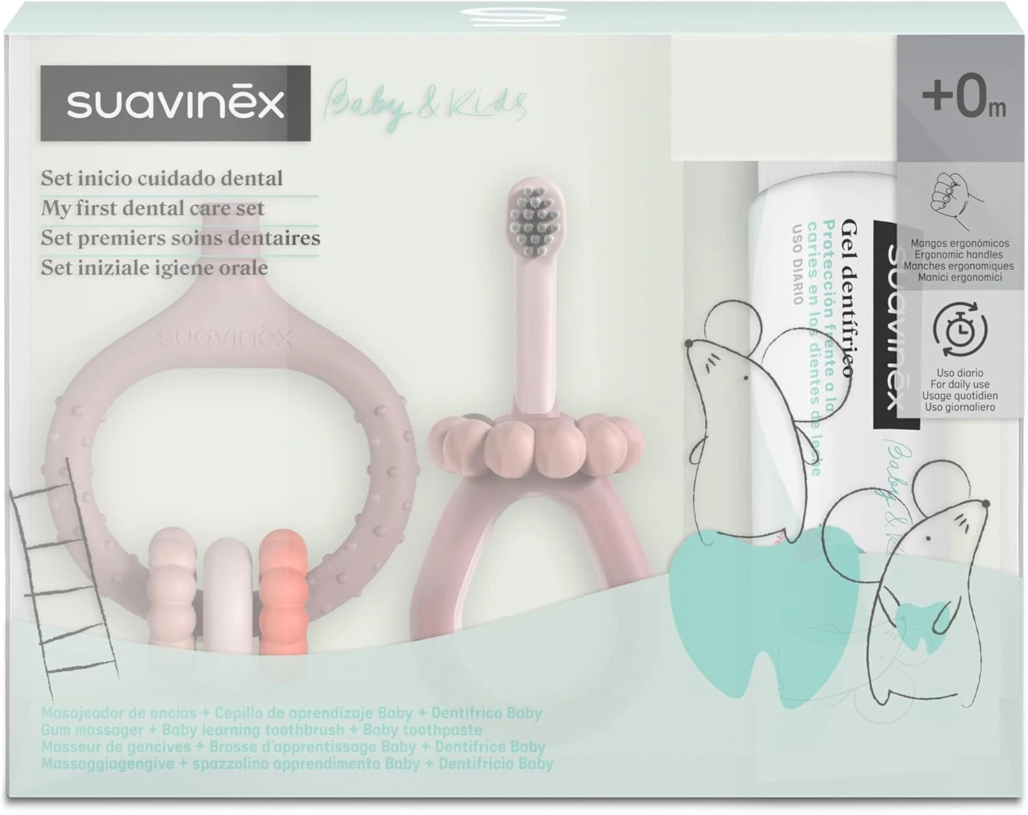 Il set primo igiene dentale 0+ rosa di Suavinez è il compagno ideale per i primi sorrisi del tuo bimbo. Include un massaggiagengive in silicone morbido e facile da pulire, perfetto per lenire le gengive durante la dentizione. Lo spazzolino d’apprendimento, con manico ergonomico e anello di sicurezza, aiuta a pulire e massaggiare delicatamente denti e gengive fin dal primo dentino. Il gel dentifricio protegge efficacemente dai cari dentini da latte, assicurando un’igiene completa e quotidiana. Un trio dolce e divertente per rendere speciale ogni pulizia!