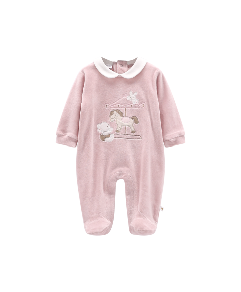 Avvolgi il tuo piccolo nella morbidezza irresistibile della nostra tutina in ciniglia con adorabile design a cavallino. Realizzata con tessuto ciniglia di alta qualità, questa tutina offre: